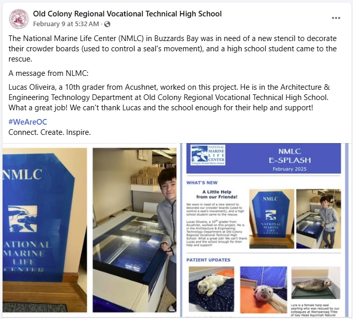 We are pleased to share this piece concerning a sophomore at Old Colony Regional Vocational Technical in Rochester. Lucas Oliveira designed the stencil applied to all of the Crowder boards used by the National Marine Life Center. (These are boards to control seal’s movement.)