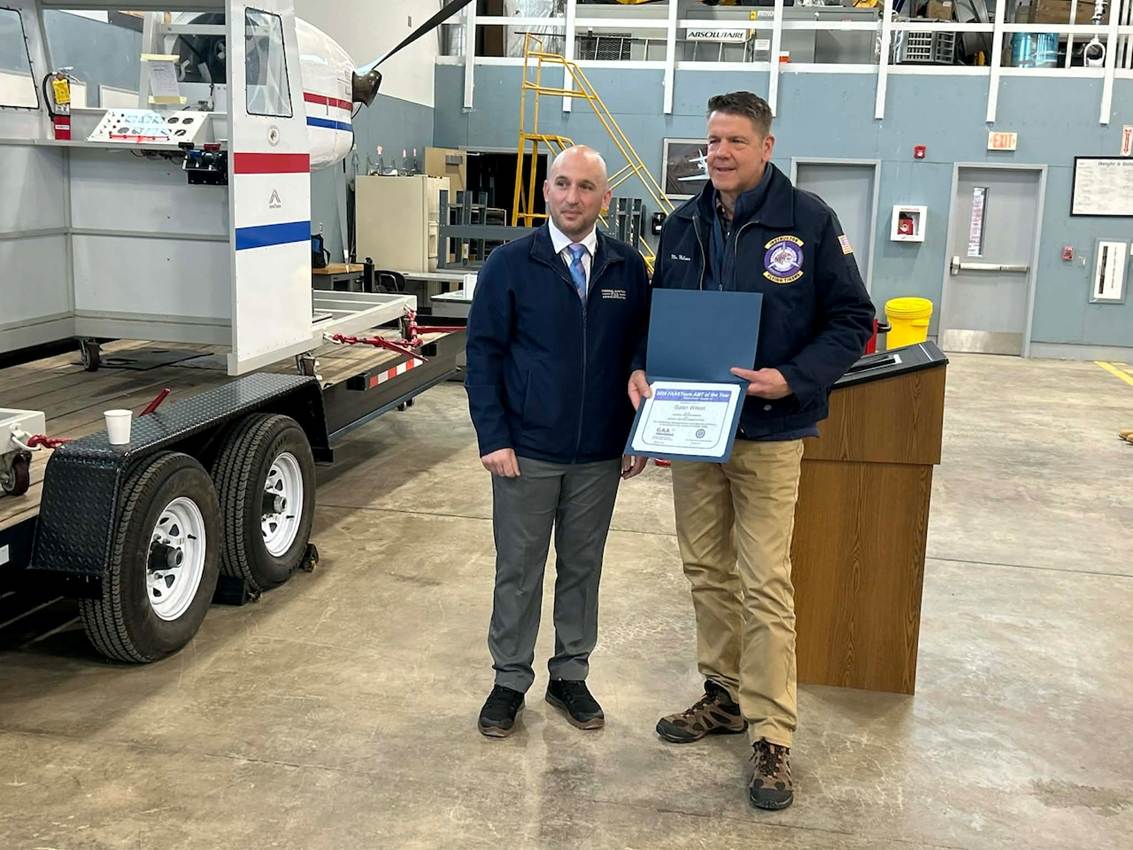 <![endif]>Daniel Lucia (left), the FAA Safety Team program manager in Enfield, awards Westfield Technical Academy instructor Galen Wilson (right) with the Bradley district’s Aviation Maintenance Technician of the Year award on March 5 at Westfield-Barnes Regional Airport. (RYAN FEYRE/WESTFIELD NEWS)Ryan Feyre